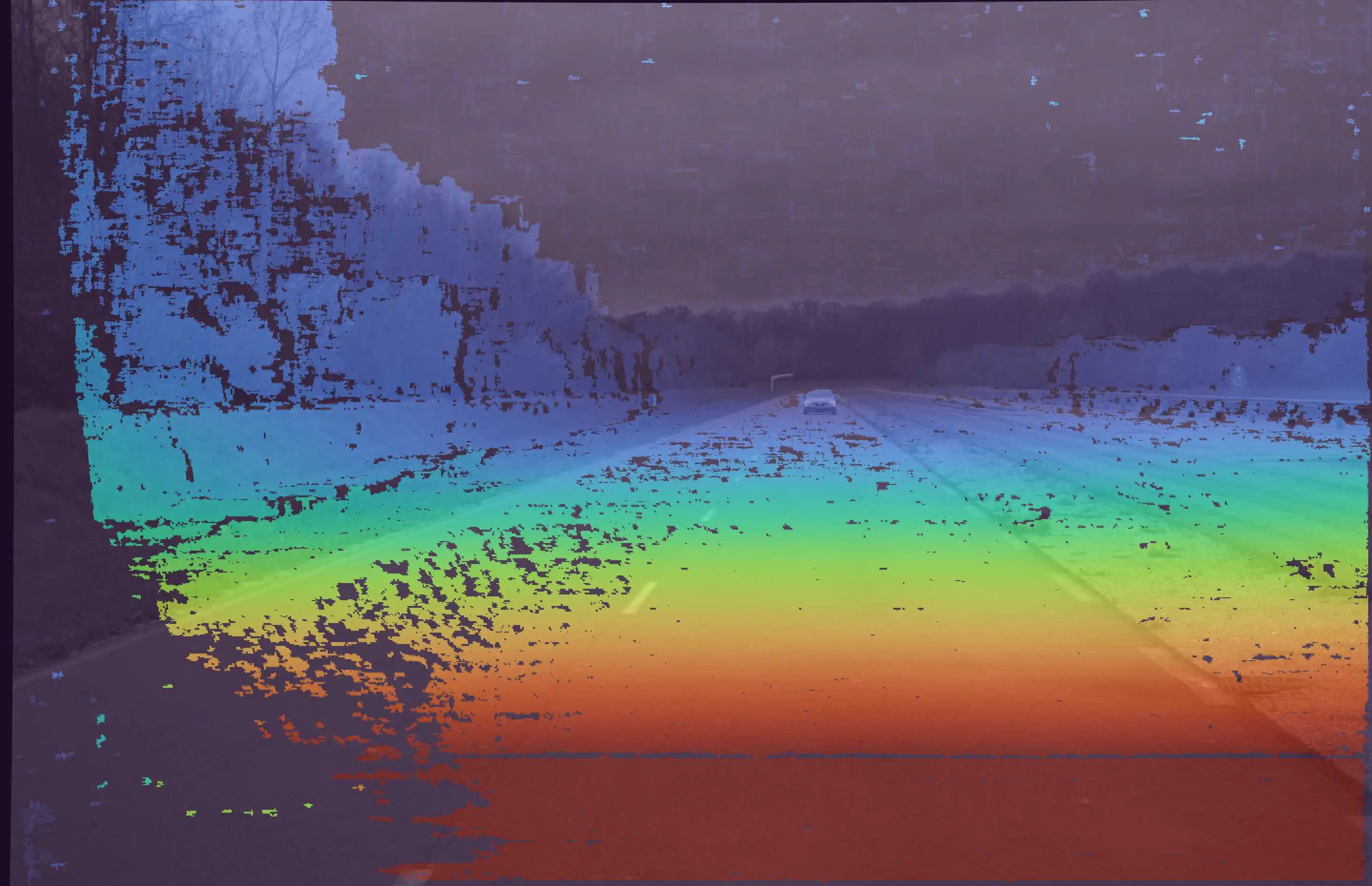 The data constitutes two stereo image pairs collected from cameras mounted on a vehicle. There is a target vehicle which is in the field of view of the stereo setup and is approaching the ego vehicle from a far away distance (~0.5 km). Even at the farthest distance, we observe dense depth data on the target vehicle with ~600 valid pixels. This enables the object detection and tracking module to reliably classify it as an object across all frames. The BEV visualization appropriately depicts enhanced pointcloud density at the target locations.